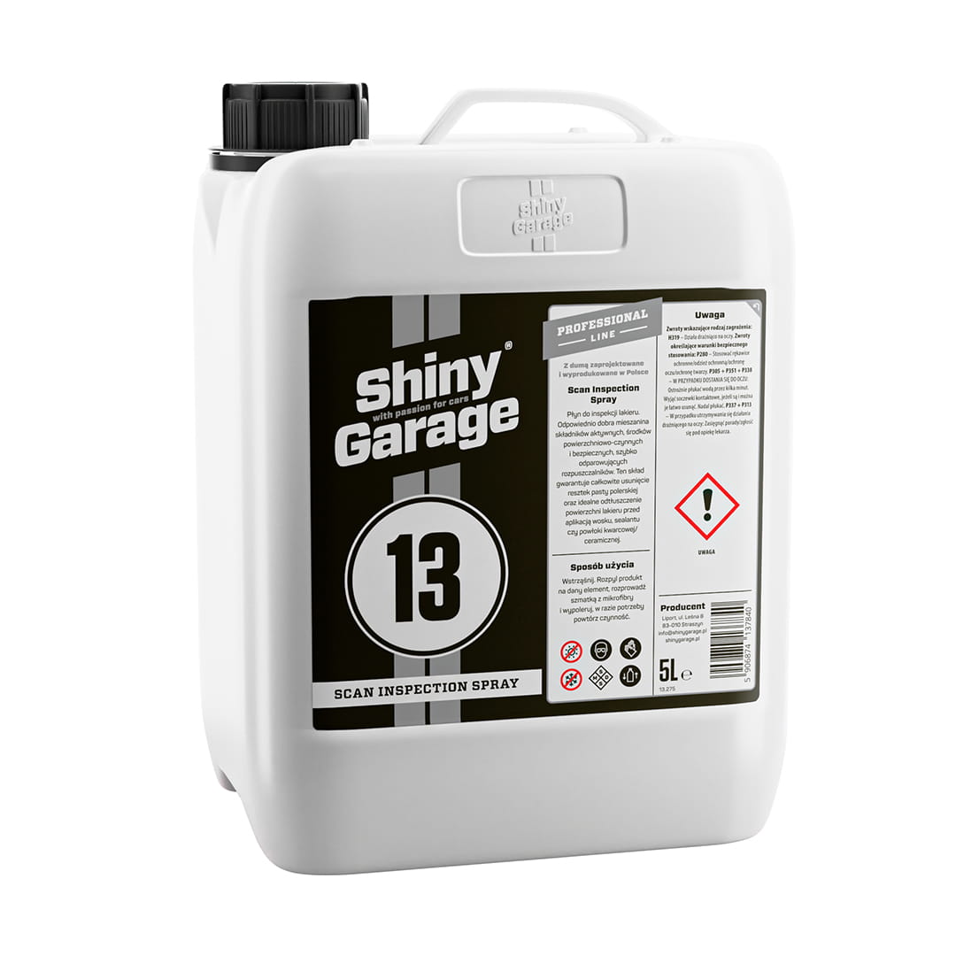 Scan Inspection Spray è un fluido per l'ispezione della vernice. L'apposita miscela di principi attivi, tensioattivi e solventi sicuri e a rapida evaporazione garantisce la completa rimozione dei residui di pasta lucidante e un perfetto sgrassaggio della superficie verniciata prima dell'applicazione di cera, sigillante o rivestimento al quarzo/ceramica.